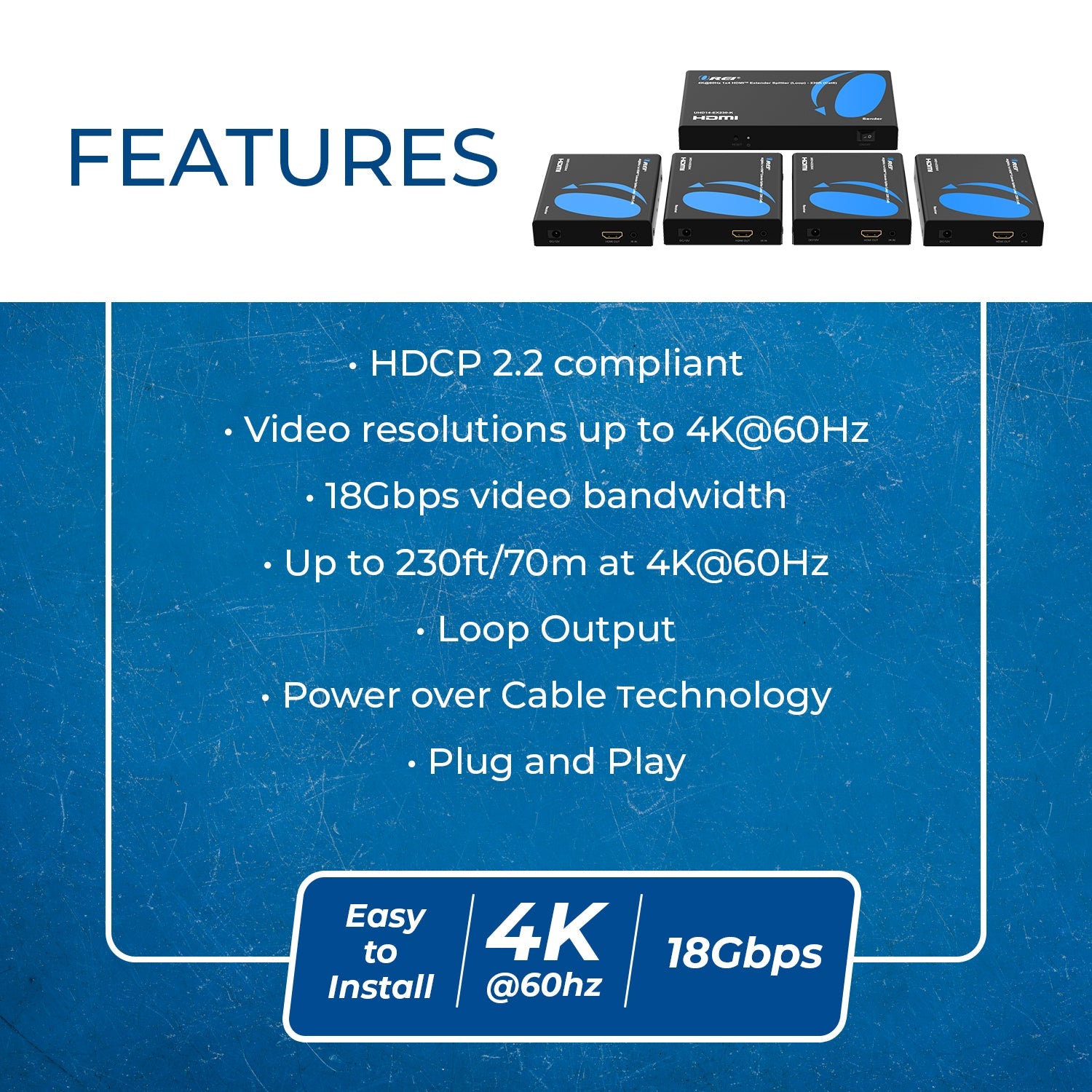 4K@60Hz 1x4 HDMI™ Extender Splitter (Loop) - 230ft (Cat6) (UHD14-EX230-K)