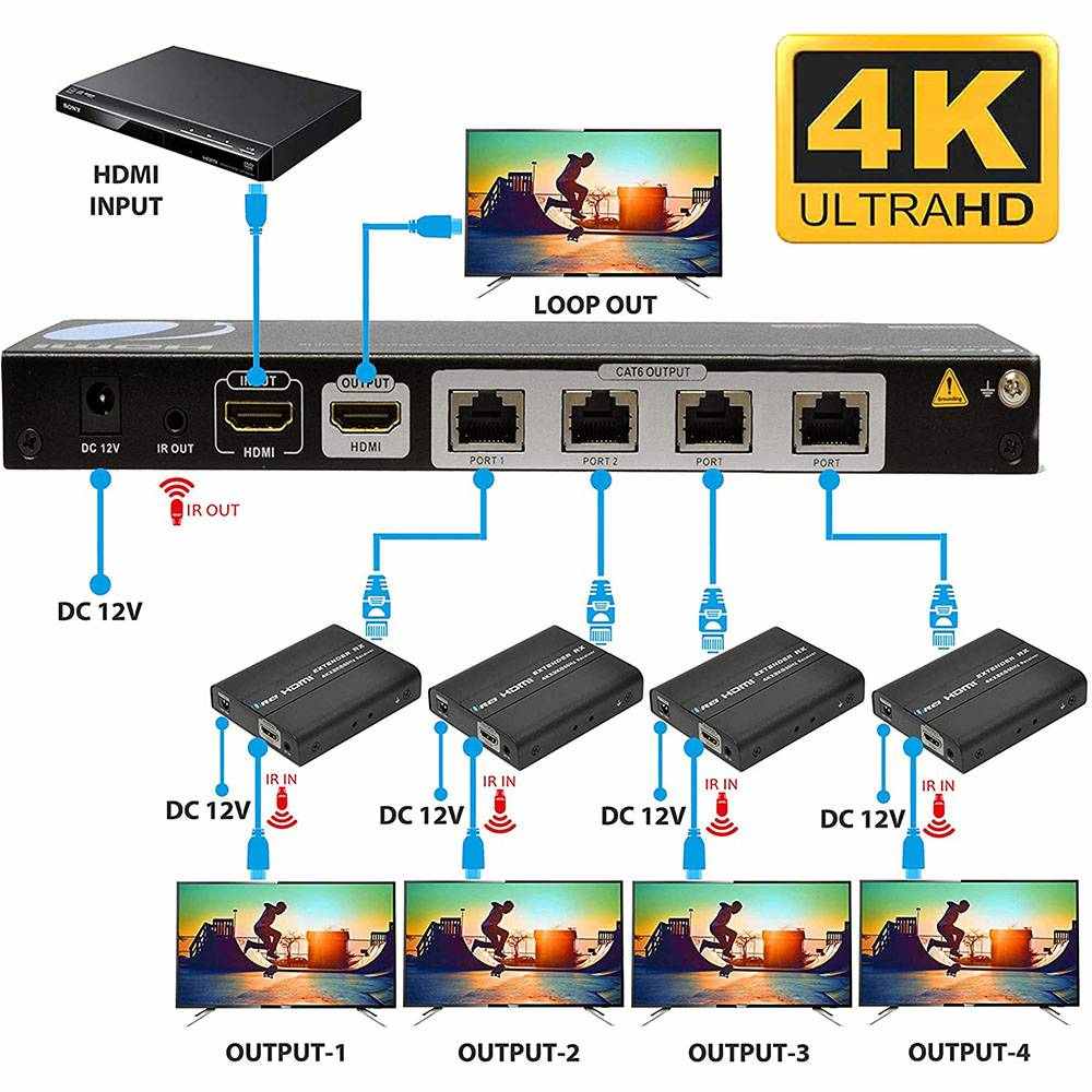 4K Ultra HD 1x4 HDMI Extender Splitter Over CAT6/7 Up to 100 Feet with Loop-out, IR Blaster & EDID (UHD14-EX100-K)