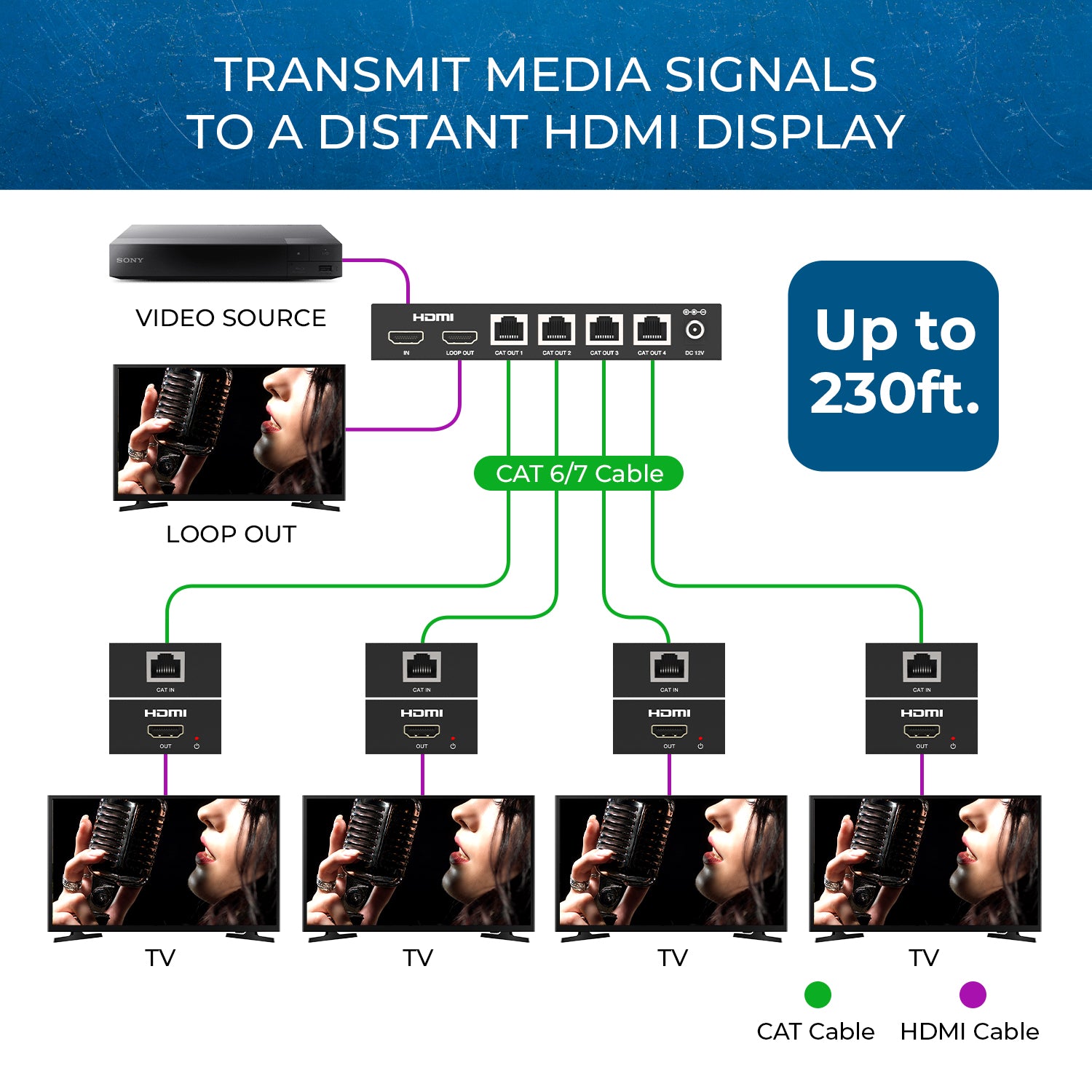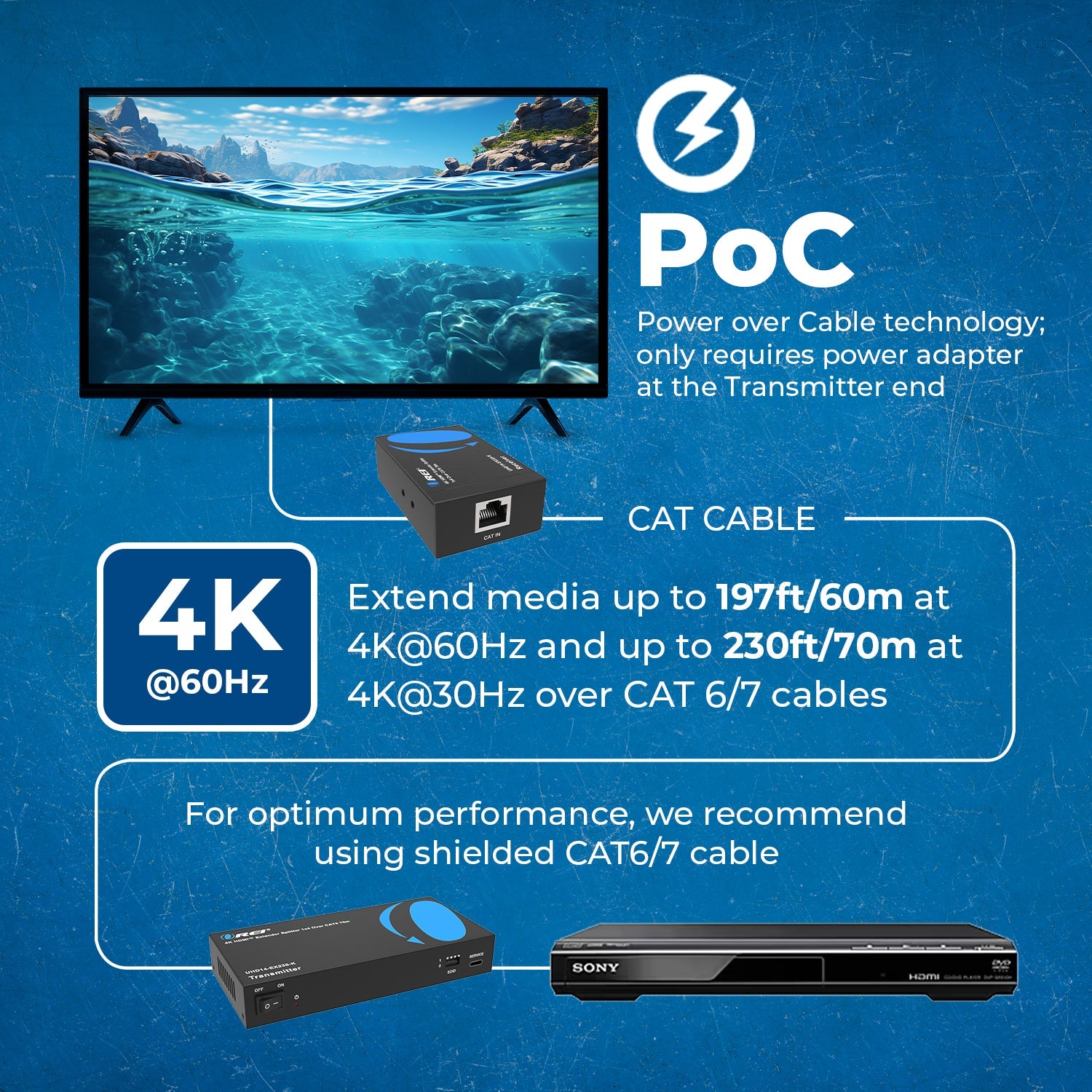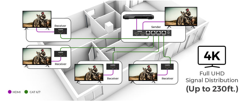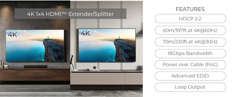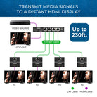 The transmitter features an HDMI loop-out, allowing for a local display connection while simultaneously extending the signal up to 230 feet (70 meters) at 4K@30Hz or 197 feet (60 meters) at 4K@60Hz using a single Cat6/6A/7 cable.