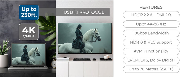 The UHD-EX230-KVM1 is a high-performance HDMI extender with integrated KVM functionality, designed to transmit audio/video signals and provide remote control of a connected PC. It extends 4K@60Hz media content up to 70 meters (~230 feet) over a single CAT6/7 cable with full compliance to HDMI 2.0 and HDCP 2.2 standards.