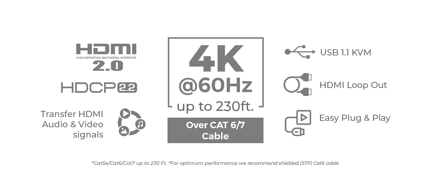 - Extends media up to 70 meters – Reliable HDMI transmission over CAT6/7 cable at 4K@60Hz.