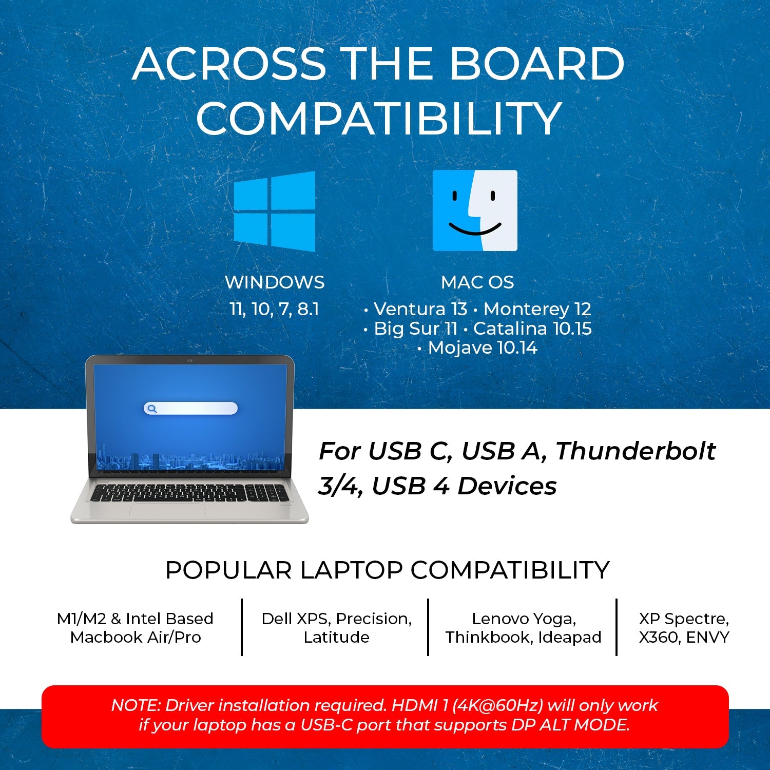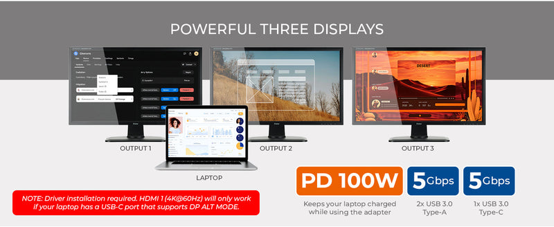 For triple display output to function correctly, driver installation is required (Silicon Motion). The adapter is compatible with Windows 7/8/10/11 and macOS 10.10 or higher. Designed for general productivity, browsing, and office applications, this hdmi splitter for laptop use is not intended for gaming or high-end graphics. Your device must support USB video output to ensure proper operation.