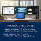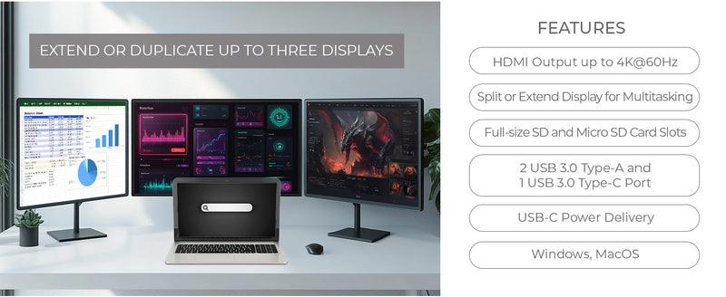 The adapter supports 100W Power Delivery via USB-C passthrough, keeping your laptop charged while connected to multiple displays and accessories. Built-in SD and Micro SD card readers provide quick access to media files—perfect for content creators and professionals using this as a laptop extender for daily workflows.
