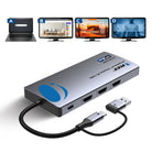 With both USB-A and USB-C connectors, this usb 3.0 hdmi adapter supports fast, stable data transfer and is compatible with USB 3.1 Gen 1, Thunderbolt 3/4, and standard USB-C ports. It includes two USB-A ports and one USB-C 3.0 port for external peripherals, combining the functions of an hdmi splitter, hdmi extender, and laptop monitor extension into one sleek device.