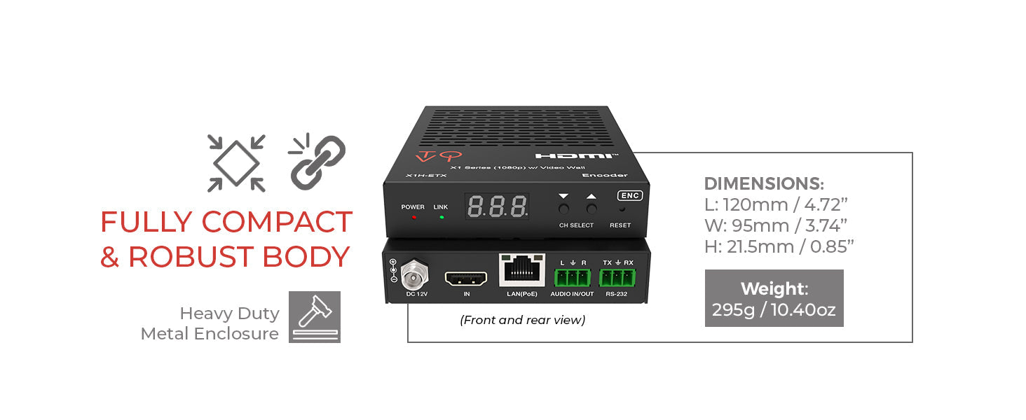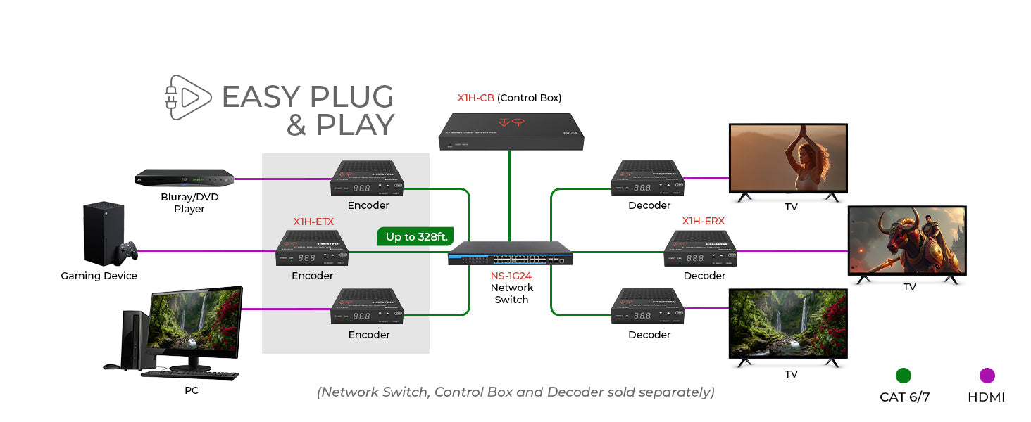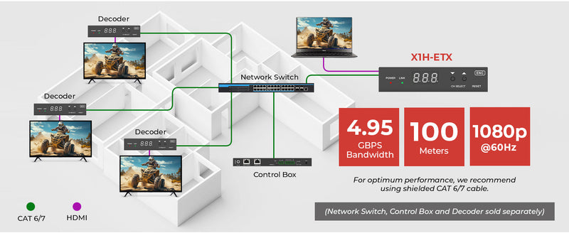 Extend HDMI signals up to 328ft (100m) over Cat5e/6/6a/7 cables without compromising quality. With a 4.95Gbps video bandwidth, the X1H-ETX provides smooth and stable transmission, making it ideal for large venues, complex AV systems, and long-distance installations.