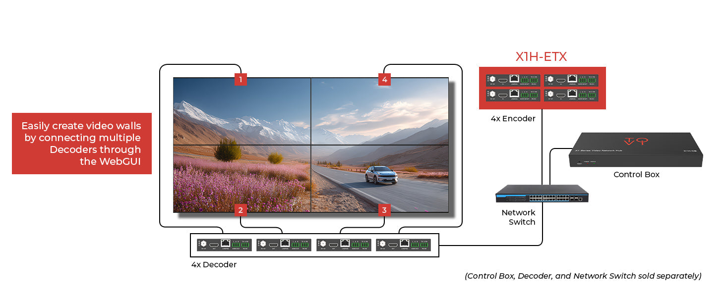 Configure and manage your AV system with multiple control options, including RS-232, TCP/IP, panel buttons, Web GUI, or the X1H-CB control box. Intelligent video wall management allows easy setup of layouts up to 9×9, with features like main/sub-stream encoding, audio embedding/extraction, and multicast or matrix switching for versatile AV distribution.