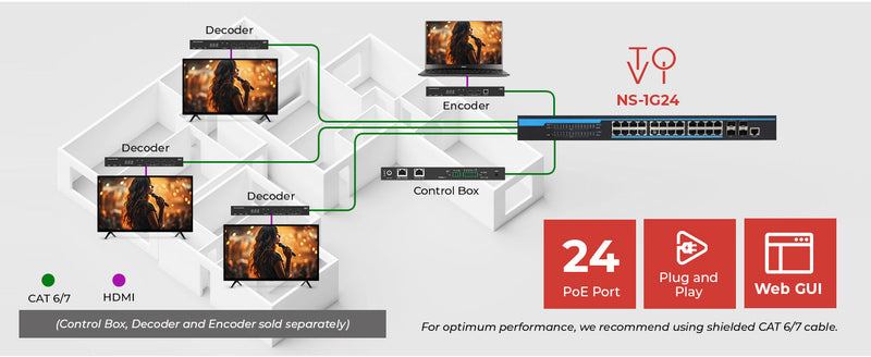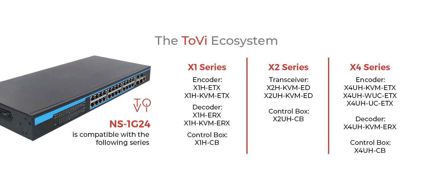 With plug-and-play setup for quick deployment and a web-based management interface for centralized monitoring and control, network management becomes intuitive and efficient. The PoE support simplifies installation by powering connected devices such as cameras and AV-over-IP transmitters directly through the network. Purpose-built for ToVi's X1, X2, and X4 series, the NS-1G24 ensures seamless integration and optimized performance within the ToVi ecosystem.