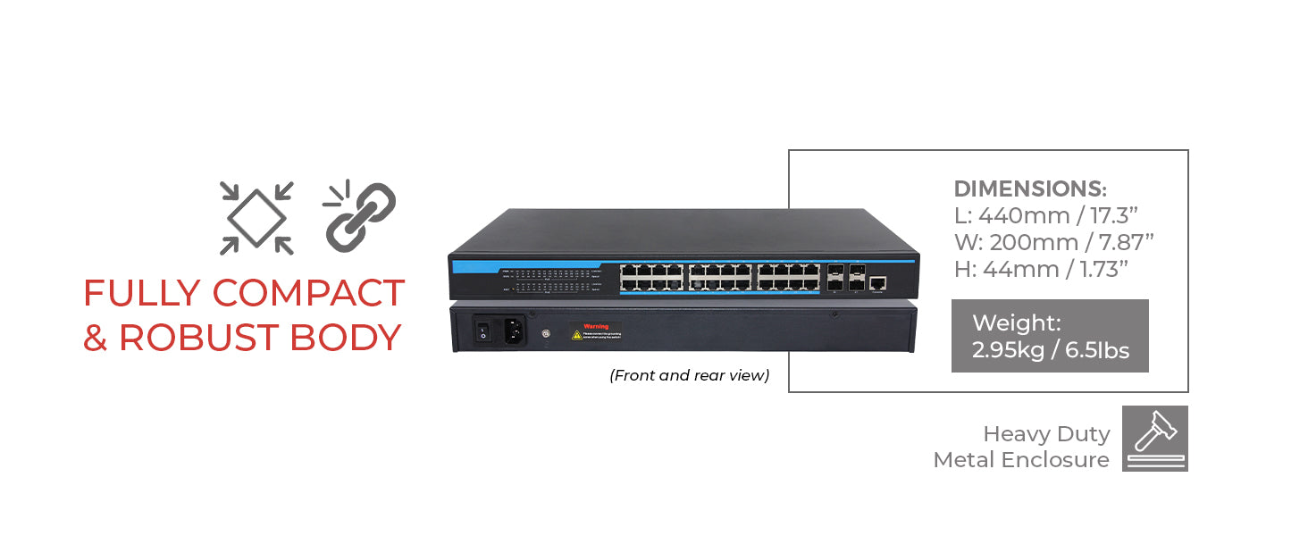 Featuring a standard 19-inch 1U rackmount design, this network switch fits easily into rack-mounted or desktop configurations. Its rugged metal housing offers superior durability and long-term reliability, making it perfect for a variety of environments including surveillance systems, enterprise AV networks, and IT infrastructure.