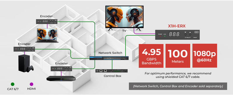 Extend HDMI signals up to 328ft (100m) over Cat5e/6/6a/7 cables without signal degradation. With 4.95Gbps video bandwidth, the X1H-ERX supports smooth and stable transmission, enabling reliable operation for large-scale and long-distance AV installations.