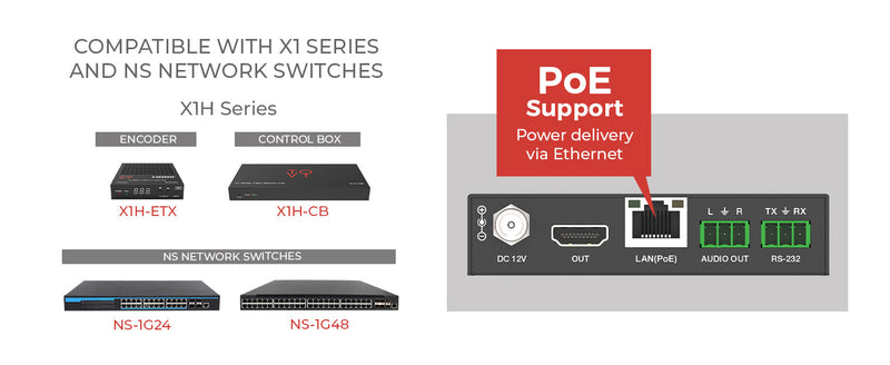 Power over Ethernet (PoE) allows single-cable power and data transmission, simplifying installation and reducing clutter. Combined with smart network design, the X1H-ERX delivers quick, scalable, and reliable setup for professional AV over IP deployments.