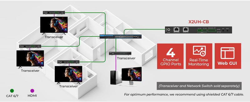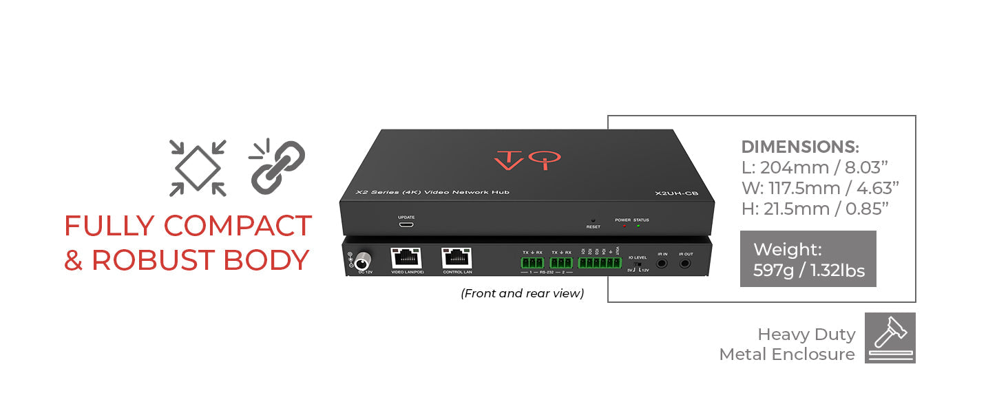 The X2UH-CB easily integrates with major 3rd party control systems and is protected against lightning, surges, and ESD. It supports PoE (802.3af PD) and includes a 12V power supply to be used if needed and is compatible with 1U/6U V2 rack installations. Built for 24/7 operation, the X2UH-CB delivers dependable performance for mission-critical AV environments.