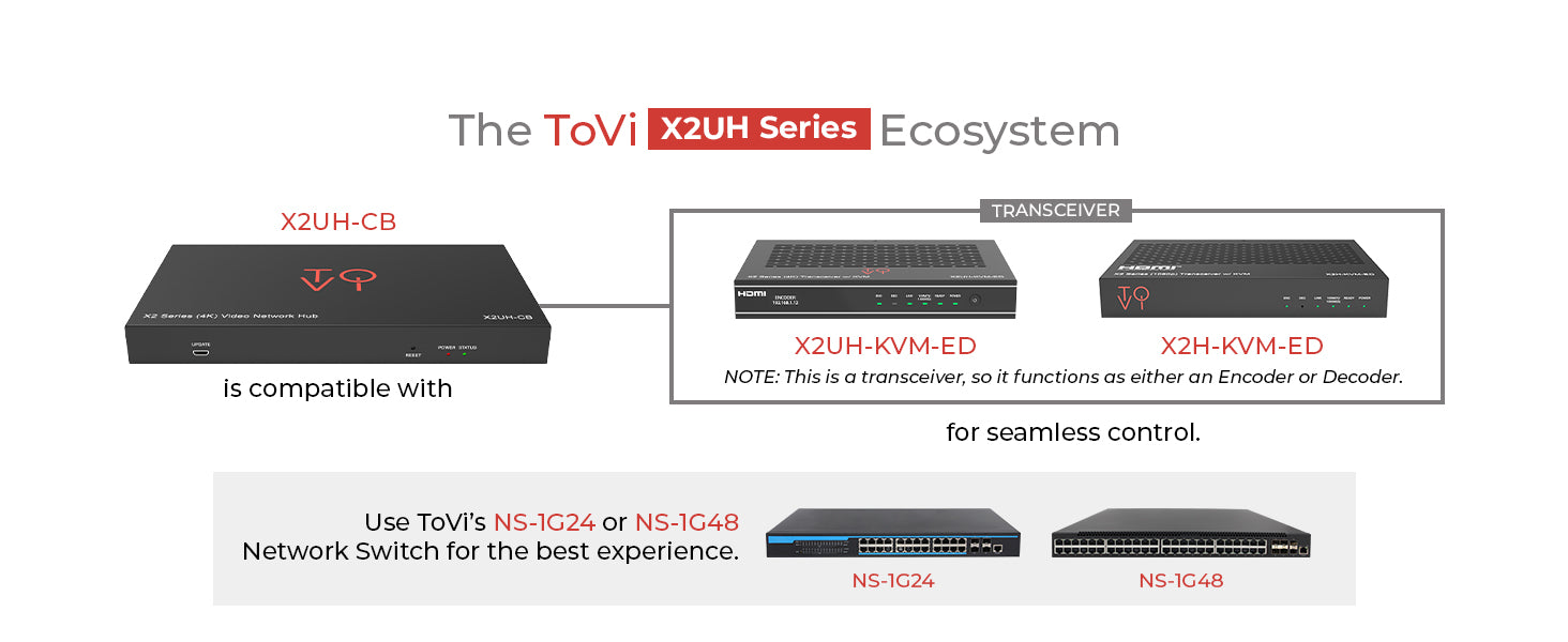 The ToVi X2UH-CB supports H.264/H.265 IP video control, enabling flexible and efficient AV signal management across distributed systems. Dual 1G network ports separate control and video distribution traffic, ensuring stable, high-performance operation for professional AV over IP deployments.