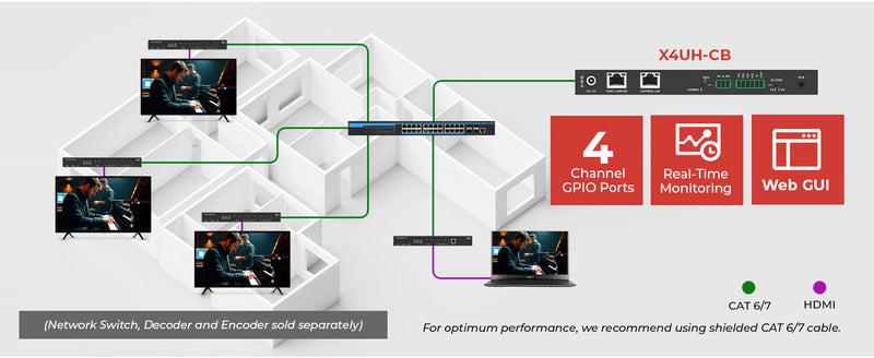 Built for demanding 24/7 operation, the X4UH-CB ensures industrial-grade protection with multi-circuit, lightning, and ESD safeguards. Dual LAN ports separate control and multicast video traffic, with PoE support on the VIDEO LAN for simplified power delivery. Additional features such as GPIO control, third-party system compatibility, and wide-band IR signal reception deliver powerful, continuous performance in mission-critical AV installations.