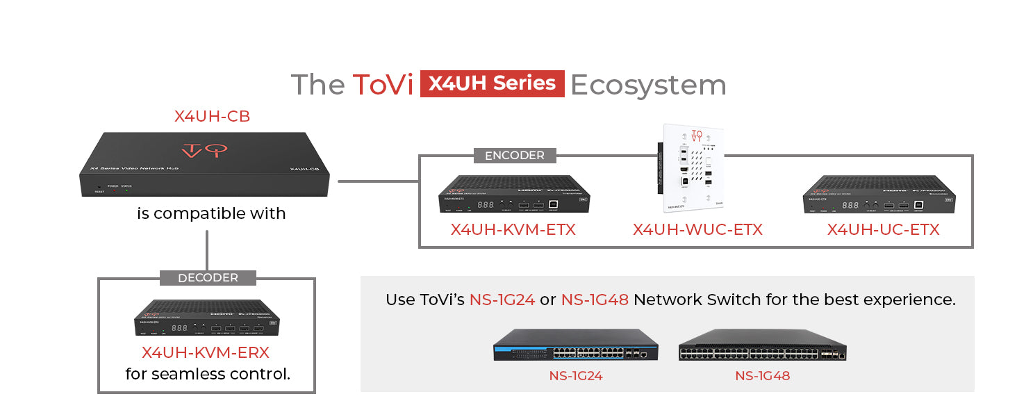 The X4UH-CB is a high-performance video network hub designed to manage and control distributed AV systems utilizing the ToVi X4 Series models. Featuring dual network ports for dedicated control and multicast video traffic, it ensures efficient and secure network isolation while delivering exceptional performance and reliability.