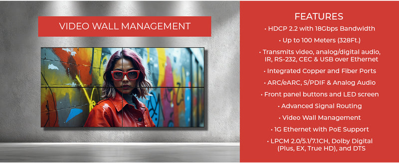 It extends AV signals up to 100 meters (328 feet) over CAT6/6A/7 cables, transmitting video, analog and digital audio, IR, RS-232, CEC, and USB data seamlessly over Ethernet.