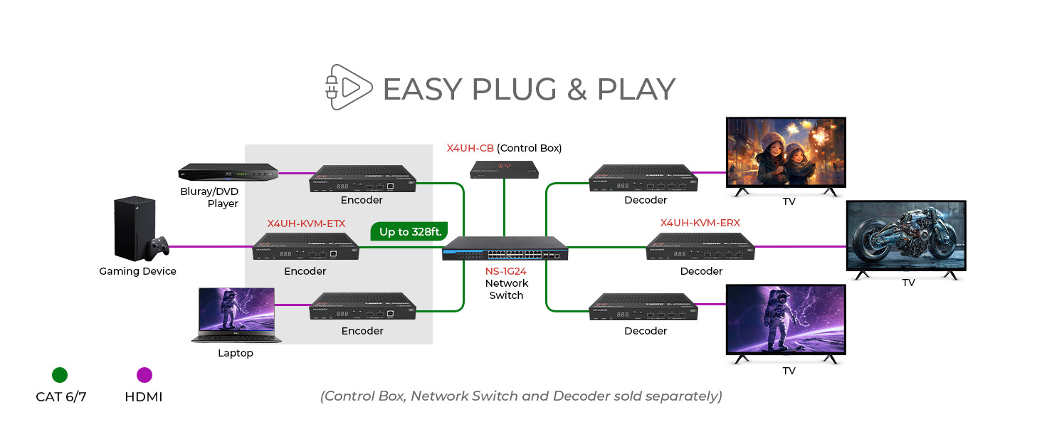 Long-Distance Extension – Extends AV signals up to 100 meters (328 feet) over CAT6/6A/7 cables.
