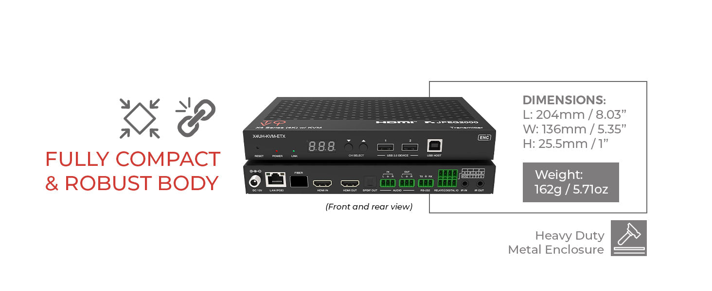 Comprehensive Signal Transmission – Simultaneously transmits video, analog/digital audio, IR, RS-232, CEC, and USB over Ethernet