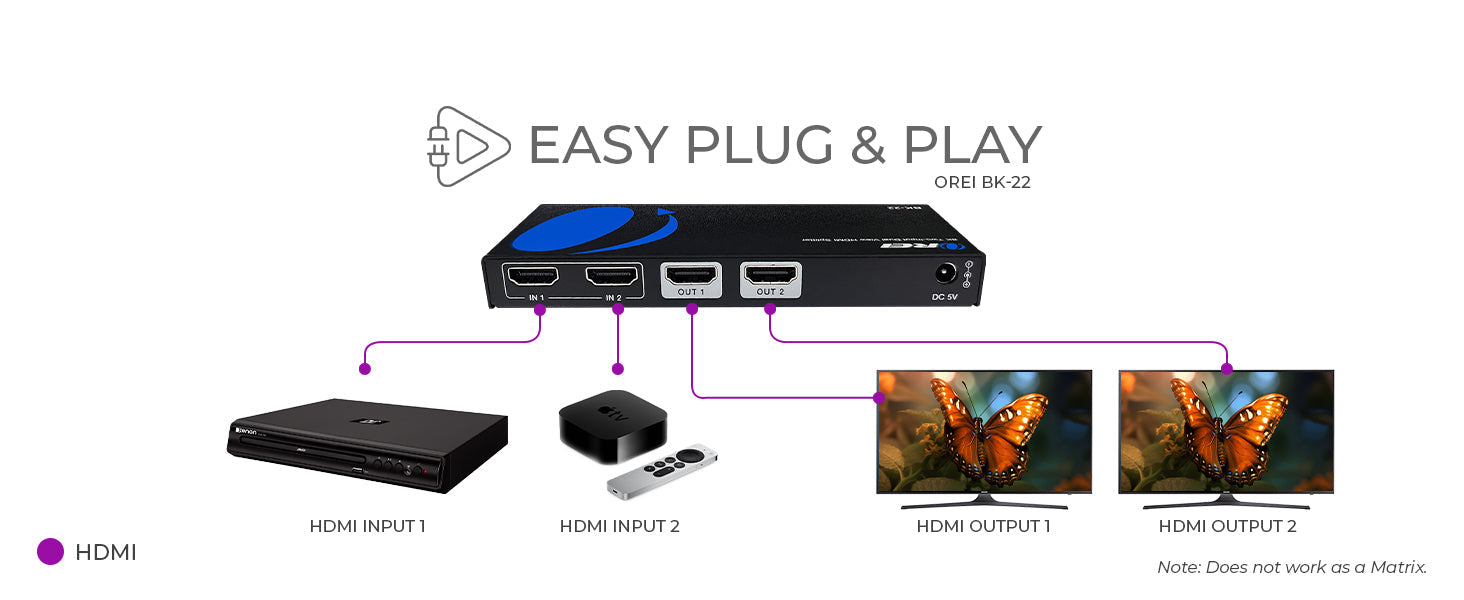 The BK-22 combines the functionality of an HDMI switch and splitter, allowing you to toggle between two HDMI sources while displaying the selected input on two screens simultaneously. Whether you're switching between gaming consoles or media players, this dual screen HDMI splitter offers seamless transitions with sharp, uninterrupted playback—ideal for both home theaters and professional AV setups.