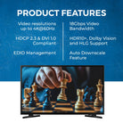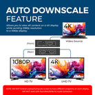 Enjoy vibrant visuals with support for HDR10+, Dolby Vision, and HLG, ensuring superior contrast and color depth. The Auto Downscale function automatically outputs 1080p to one display while maintaining 4K resolution on the other, making it perfect for mixed-display setups. This feature ensures you get the best video quality on both high-end 4K displays and legacy 1080p monitors, without any compromises in image clarity.