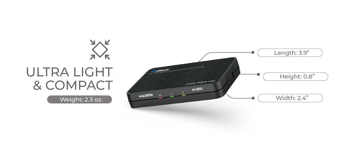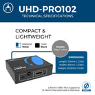 The UHD-PRO102 is a compact 1x2 HDMI splitter designed to duplicate one HDMI source to two displays with maximum clarity and efficiency. Fully compliant with HDMI 2.0b and HDCP 2.2 standards, it supports resolutions up to 4K@60Hz with 18Gbps video bandwidth.