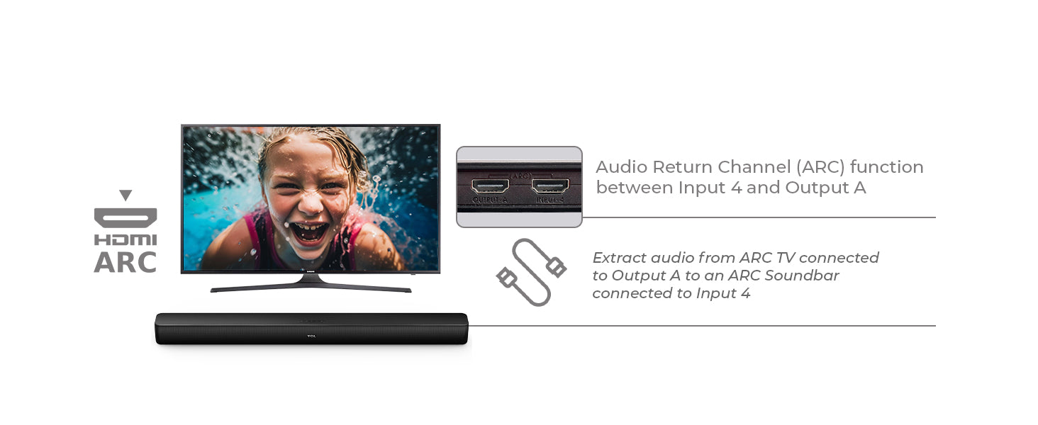 - ARC (Audio Return Channel) Support – Allows audio return from ARC-enabled TVs via Input 4 to Output A.
