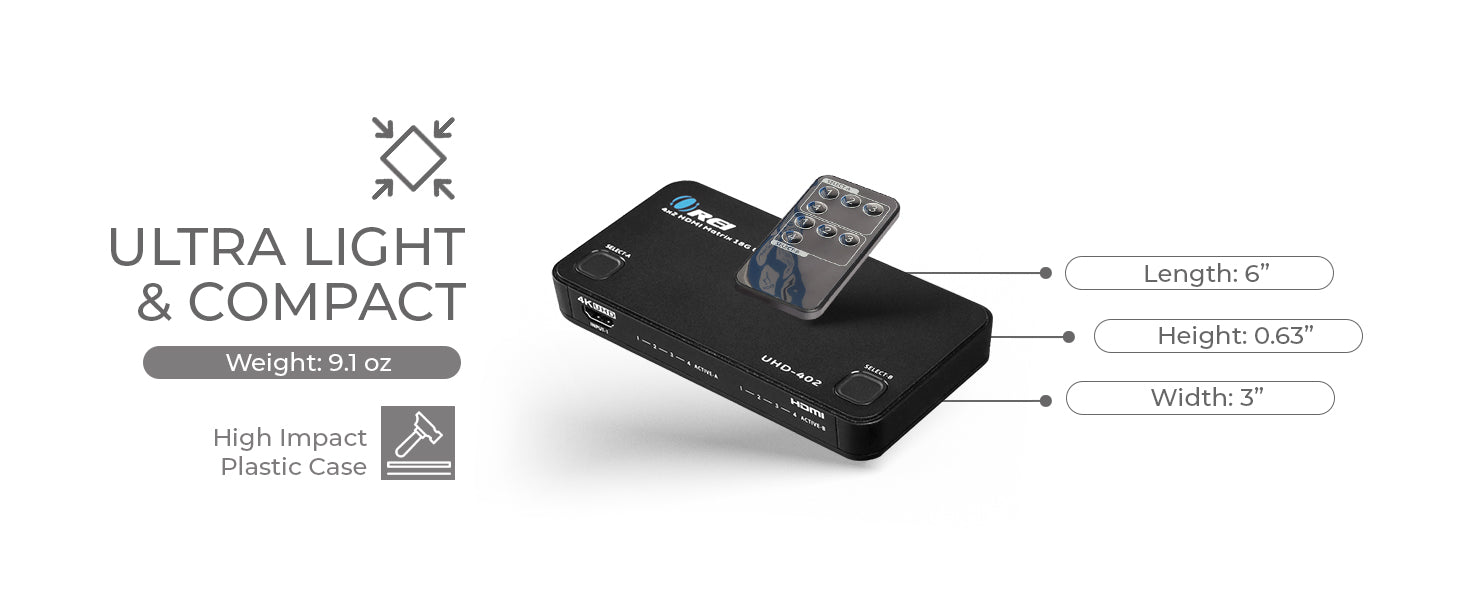 Operate the UHD-402 easily using front panel buttons or the included IR remote, providing flexible control options for any setup. Housed in a sturdy yet lightweight ABS plastic body, this matrix switcher is built to last and designed for hassle-free plug-and-play installation.