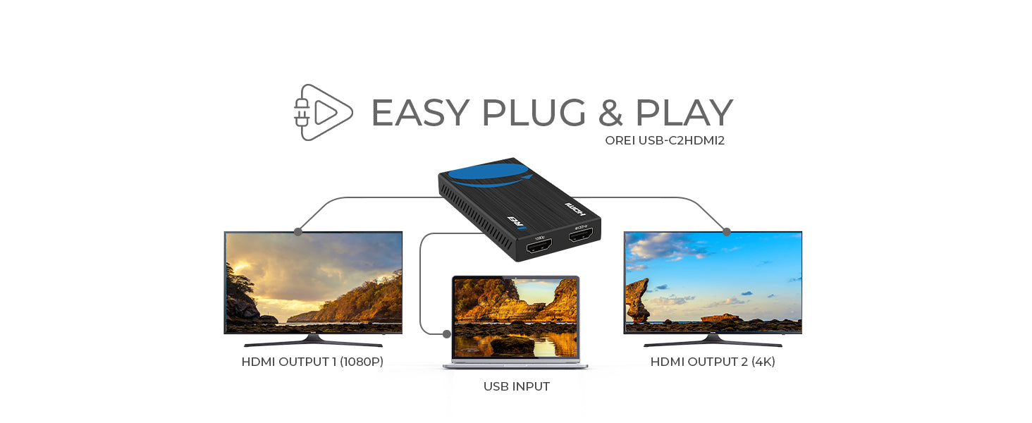 The OREI SplitExtend® USBC2HDMI2 is a USB-to-HDMI dual display adapter designed to expand your workspace with two external monitors. It supports one display up to 4K@30Hz and a second display up to 1080p@60Hz, making it ideal for multitasking, presentations, and general office use.
