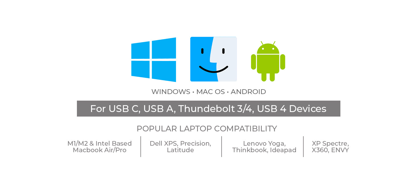 Equipped with a 2-in-1 USB-A and USB-C cable, the adapter provides broad compatibility with a wide range of devices including USB-C, USB-A, Thunderbolt 3/4, and USB4 interfaces. It supports major operating systems such as Windows 11, 10, 8.1, 7, and macOS 10.10 or later.