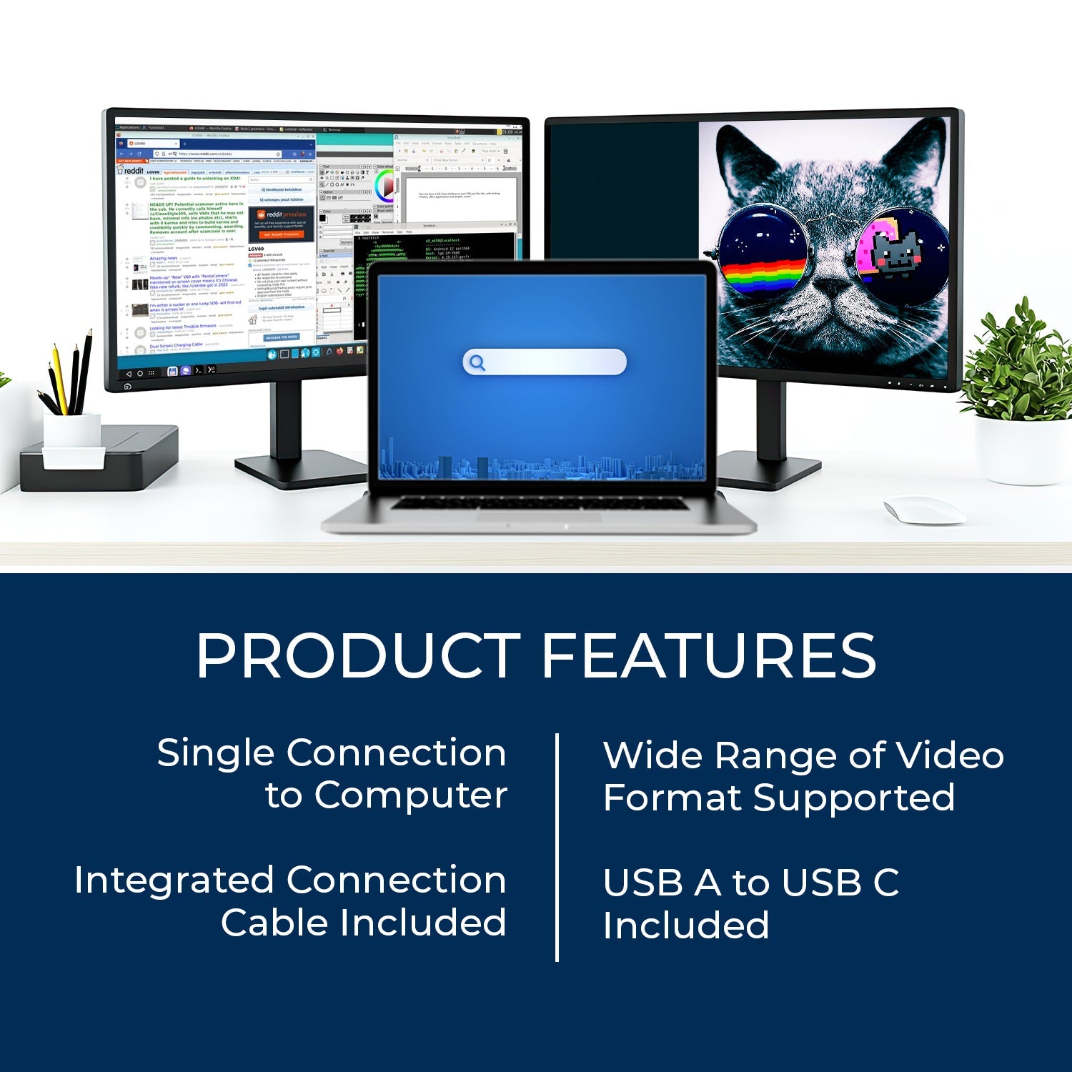 Designed with versatility in mind, it features a 2-in-1 USB-A and USB-C cable for easy connection to a variety of ports including USB 3.0, USB 3.1 Gen 1, and Thunderbolt 3/4. Compatible with both Windows and Mac systems, it supports up to 8 displays on Windows using multiple adapters.