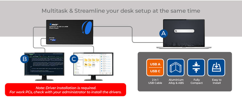 The SplitXtend SX-2C4K is a high-performance display adapter that adds two HDMI displays to your existing setup, each supporting resolutions up to 4K@60Hz. Whether you're working with spreadsheets, browsing, or running presentations, this usb 3.0 to hdmi solution delivers crisp visuals across both screens—ideal for extending or mirroring your workspace.