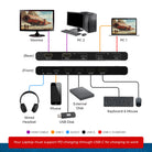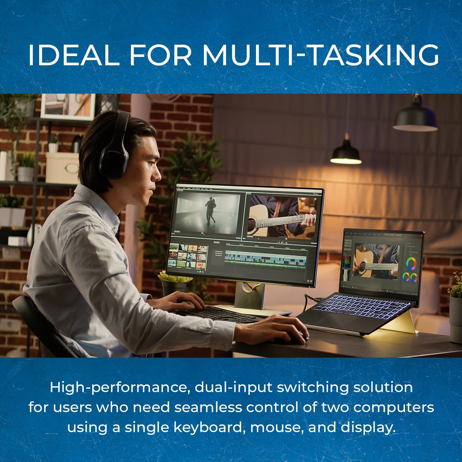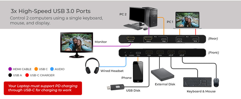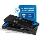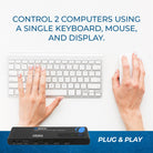 Share peripherals across both connected computers with two dedicated USB 2.0 ports for keyboard and mouse. Three additional USB 3.0 ports (2x USB-A, 1x USB-C) support blazing 5Gbps data transfer for external drives, webcams, or printers. A 3.5mm stereo output provides flexible audio options.
