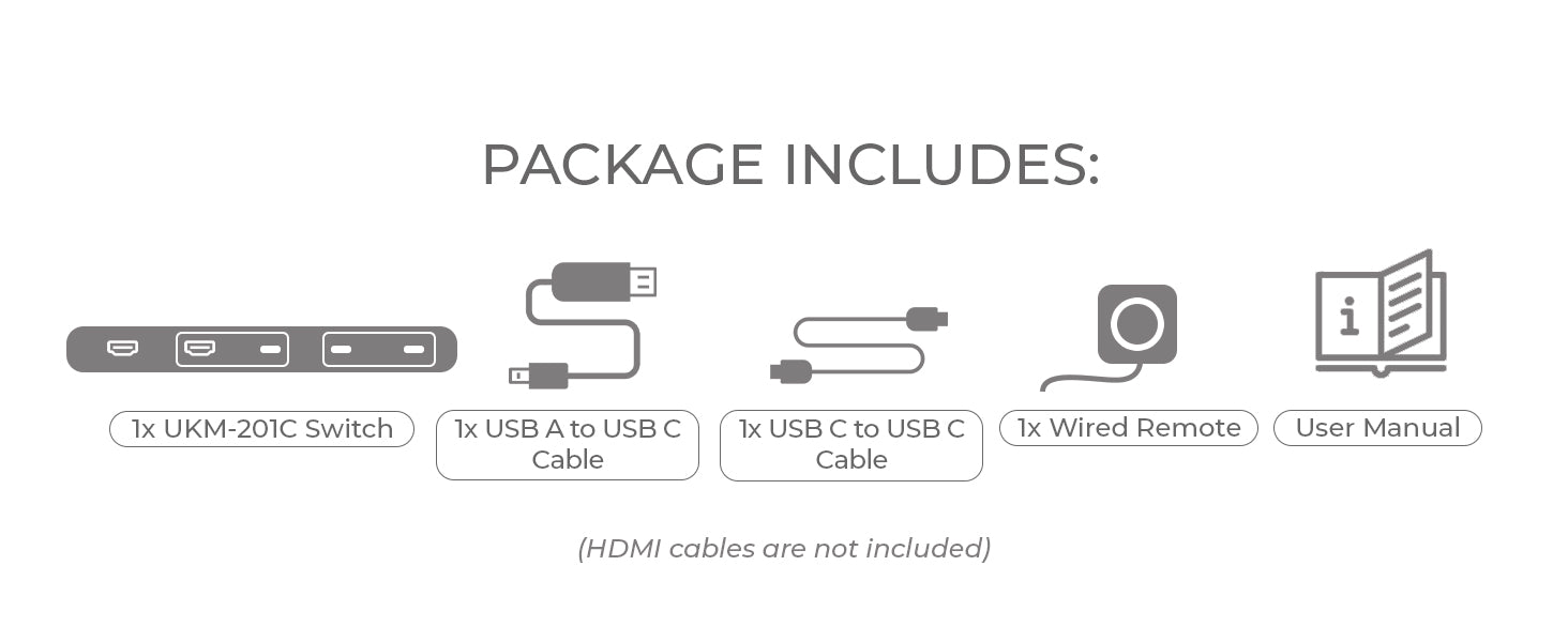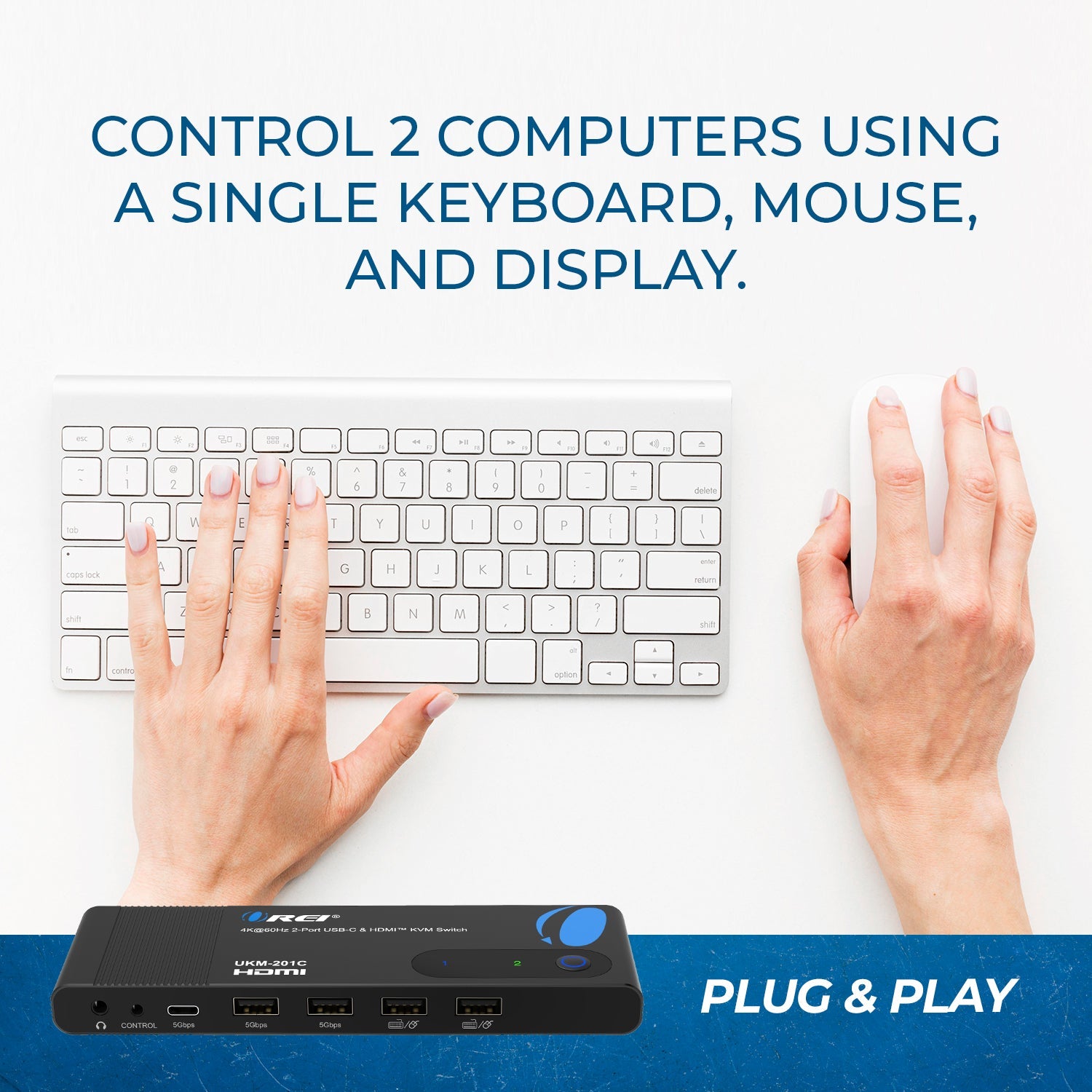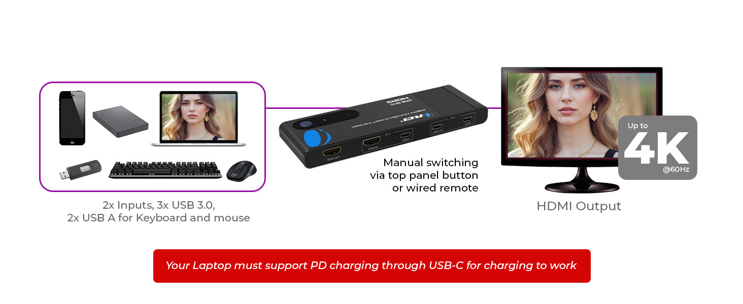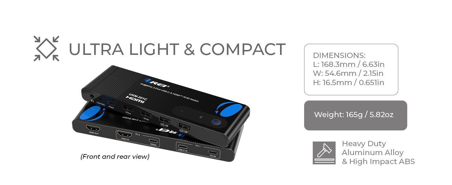 The UKM-201C lets you control two computers—one via USB-C and one via HDMI—using a single keyboard, mouse, and monitor. It supports HDMI 2.0 and HDCP 2.2, delivering ultra-clear 4K@60Hz video with HDR support. Easily switch between connected devices using the top-panel button or the included wired remote.