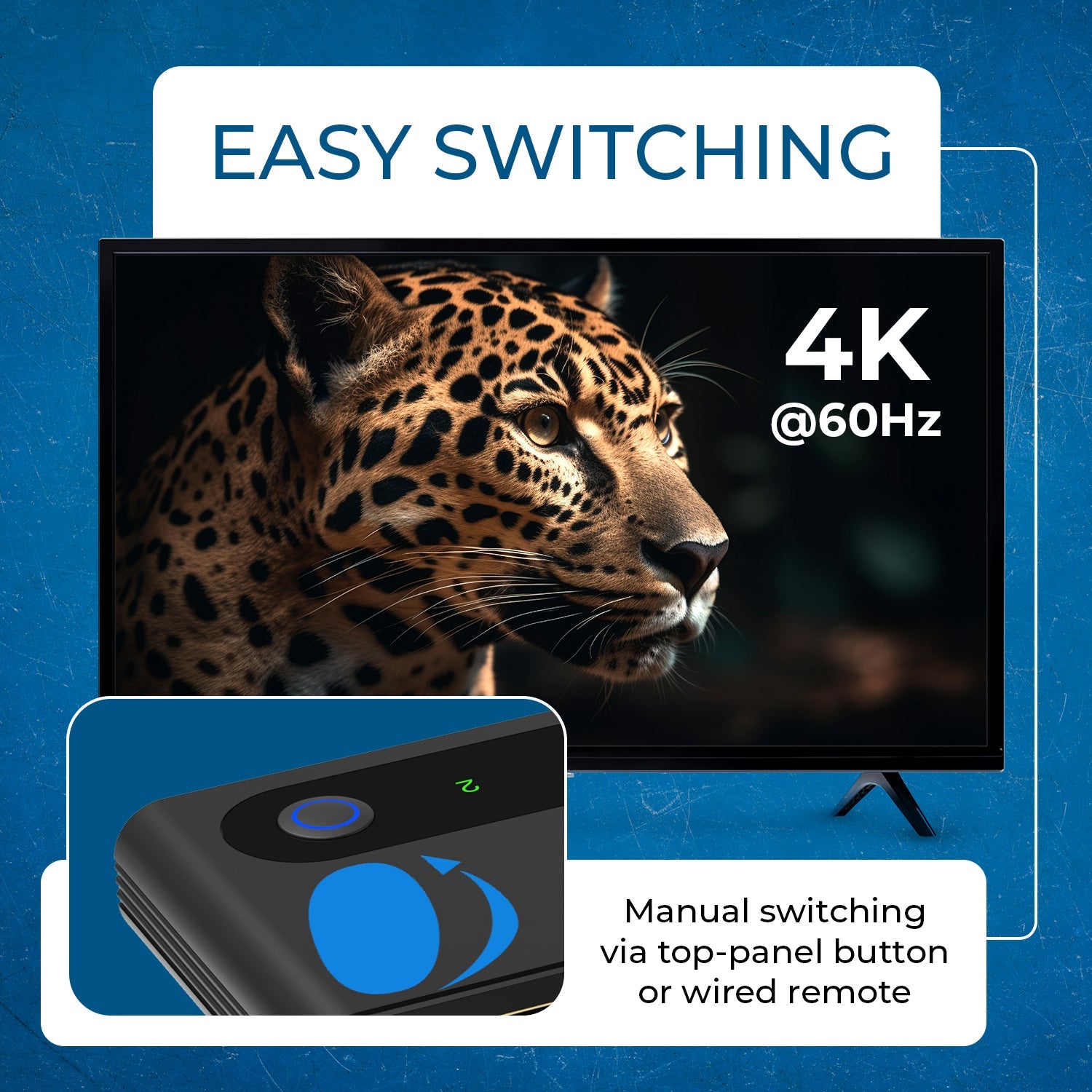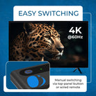 Input switching is easy and accessible via the top-panel button or the included wired remote control. Whether you’re working from home, managing a dual-system setup, or outfitting