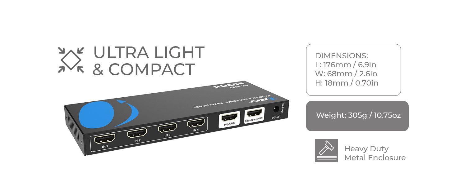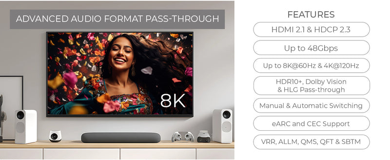 Enjoy brilliant color and contrast with support for HDR10+, Dolby Vision, and HLG passthrough. Built with gamers in mind, the switch includes VRR (Variable Refresh Rate), ALLM (Auto Low Latency Mode), QMS, QFT, and SBTM, enhancing real-time response, frame stability, and overall gameplay experience. Whether you're watching movies or gaming at high frame rates, this HDMI switch for gaming and AV delivers peak performance.