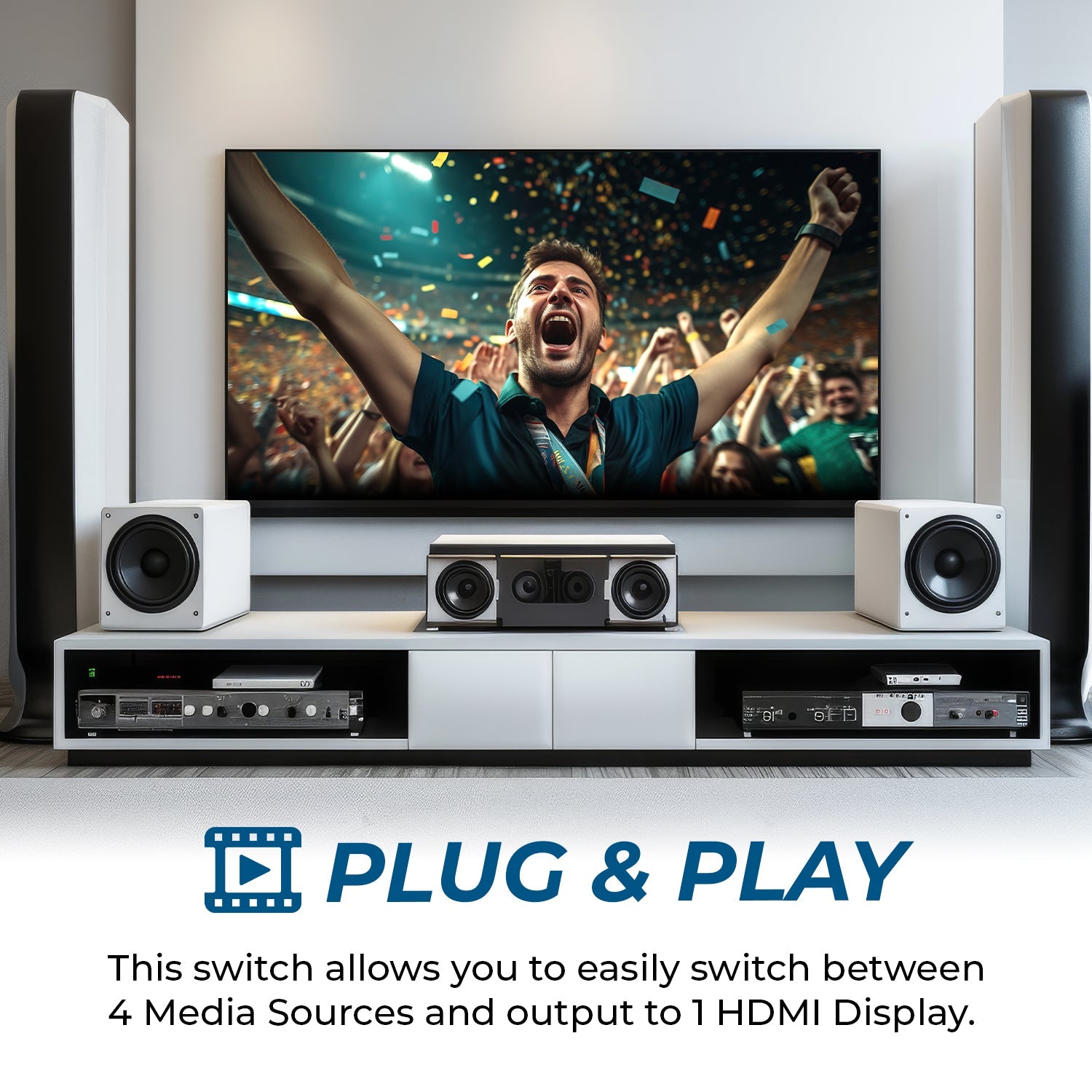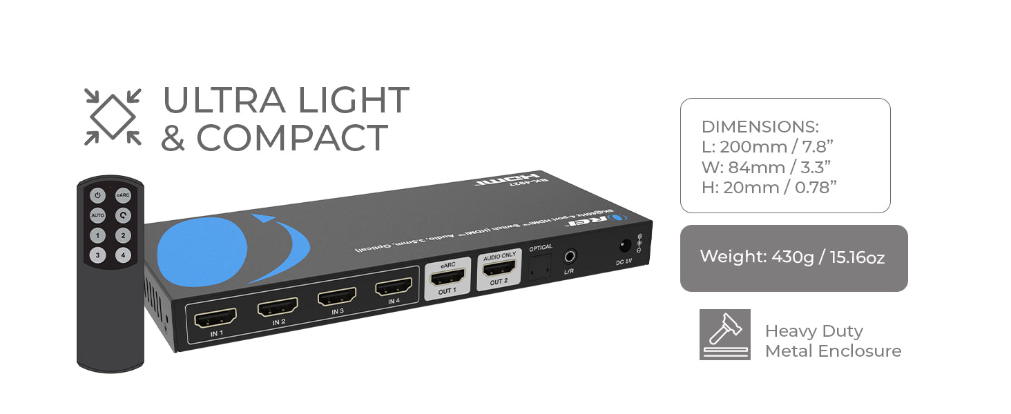 Enjoy auto or manual input switching depending on your preference. When a connected source powers on, the switch can automatically change inputs—or you can use the front panel or remote for manual control. CEC support allows you to use your TV's remote for volume and input selection. The compact, plug-and-play design makes it an ideal choice for clean, professional setups in both residential and commercial spaces.