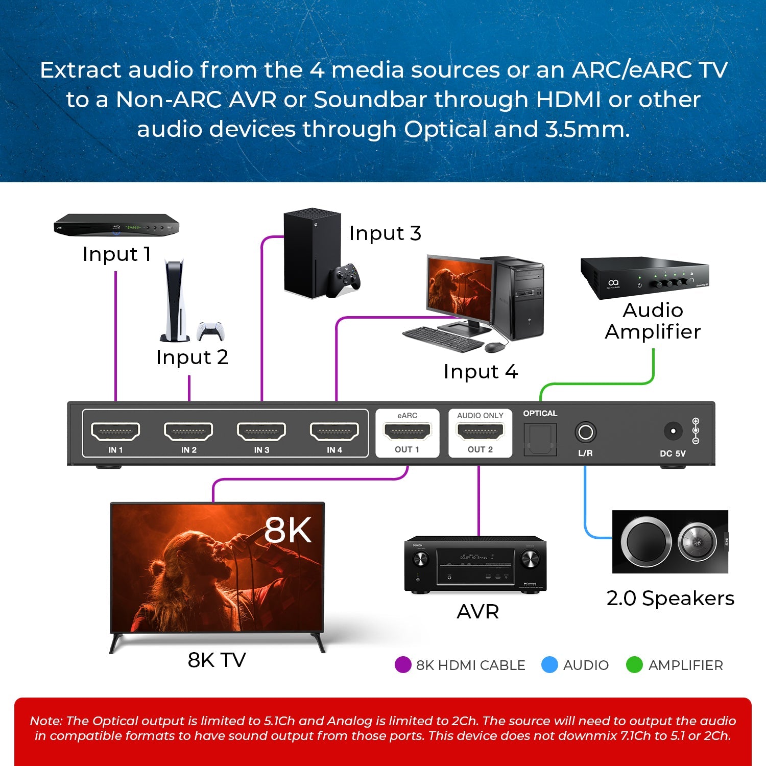 - Audio De-embedding – Extracts audio to Non-ARC AV Receivers, Non-ARC soundbars, amps, headphones, or speakers via HDMI™, SPDIF (Toslink), or 3.5mm analog output.