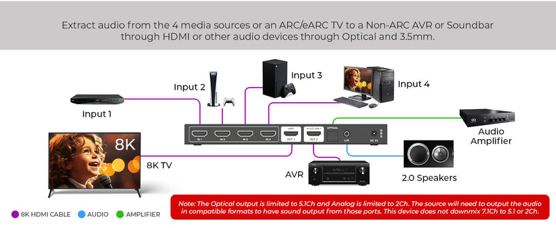 It supports HDR pass-through including HDR10+, Dolby Vision, and HLG. The audio de-embedding feature lets you route audio to a Non-ARC AV receiver, non-ARC soundbar, amp, or speaker system via HDMI™, SPDIF (Toslink), or 3.5mm output. It also includes support for Dolby Atmos, DTS:X, LPCM 7.1CH, and more for an immersive audio experience.