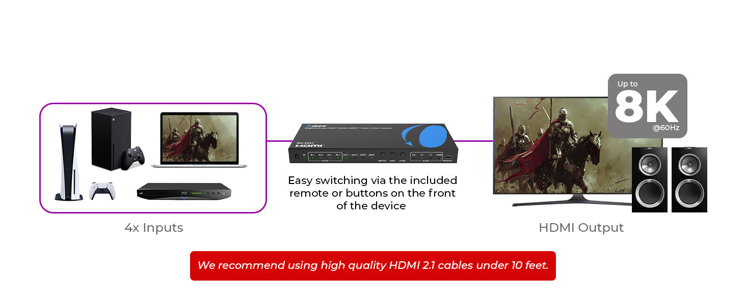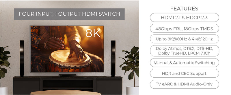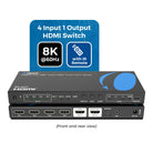 - Connect 4 HDMI™ Sources to 1 Output – Easily switch between four devices on a single 8K or 4K display.