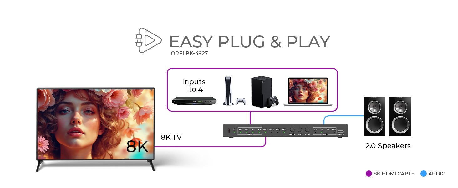 The OREI BK-4927 is a high-performance 4x1 HDMI 2.1 switch that lets you connect four HDMI source devices to a single 8K or 4K display. Perfect for home theaters, gaming rooms, or AV setups, it supports resolutions up to 8K@60Hz (4:2:0) and 4K@120Hz (4:4:4) with full HDMI 2.1 and HDCP 2.3 compliance. Whether you're switching between a gaming console, streaming box, or Blu-ray player, you'll enjoy smooth, crystal-clear visuals with no lag or loss.