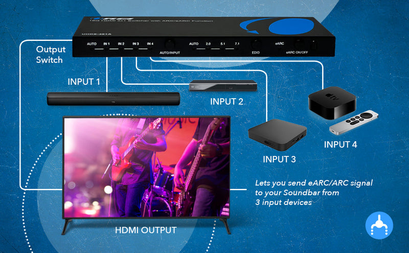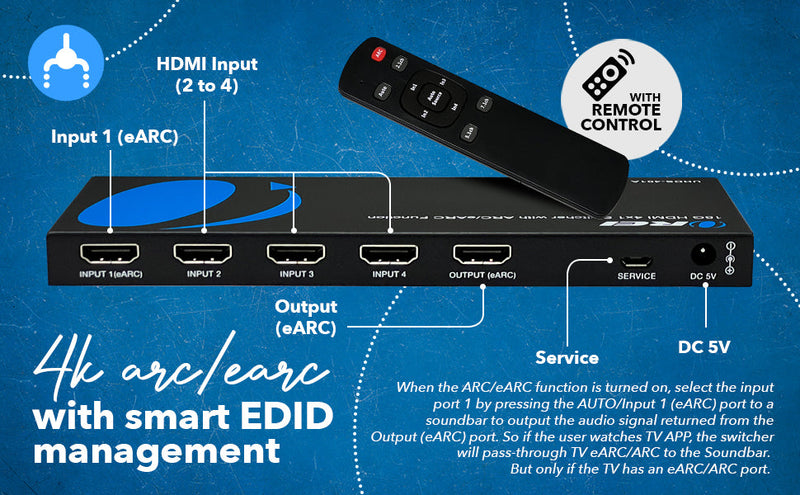The UHDS-401A-O features both analog and digital audio outputs, allowing you to route audio from your HDMI sources to external soundbars, amplifiers, or AV receivers. ARC functionality also enables audio return from ARC-enabled TVs, making it an efficient HDMI ARC switch for streamlined audio setups. Whether you're using optical or 3.5mm connections, this unit ensures flexible and high-quality sound distribution.