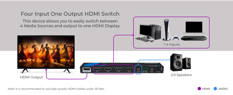 Supporting resolutions up to 4K@30Hz and 10.2Gbps video bandwidth, this HDMI switch 4K ensures detailed, high-quality output across all input sources. In single-view mode, it provides seamless switching between sources with no screen blackout—ideal for live environments or quick source changes in a switch HDMI 4K setup. It's fully HDCP 1.4 compliant, making it compatible with a wide range of media content.