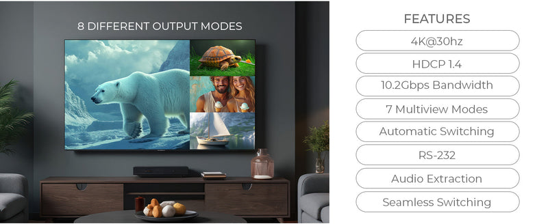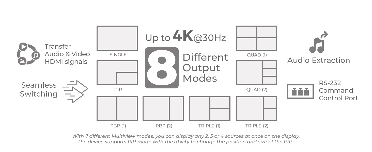 It features seamless switching in single-view mode, automatic input detection, and a 3.5mm analog audio output for audio extraction. Audio source selection is also supported via remote in Multiview mode.