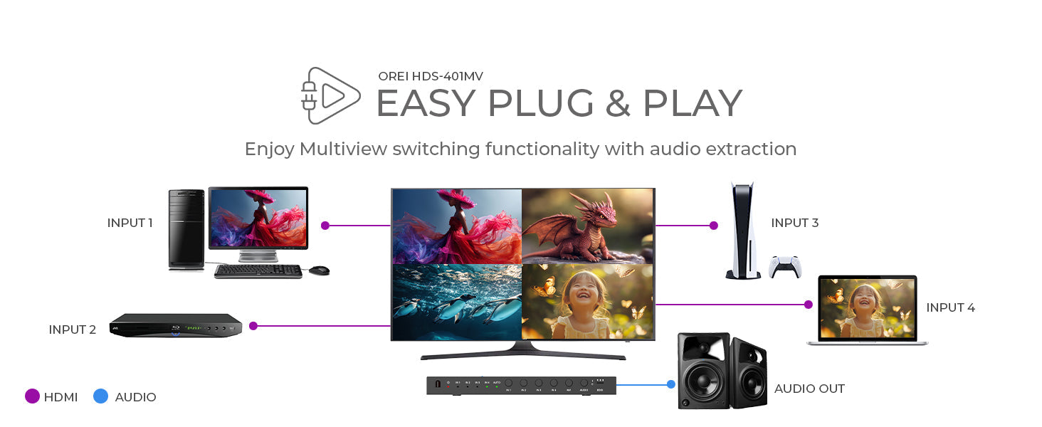 The HDS-401MV includes 3.5mm analog audio output for routing sound to external speakers or amplifiers, making it a great choice for users seeking reliable audio extract capability. In Multiview mode, you can easily choose your preferred audio source via the included remote—no need to toggle inputs manually. It's a well-rounded HDMI switch for TV and commercial audio-visual systems alike.