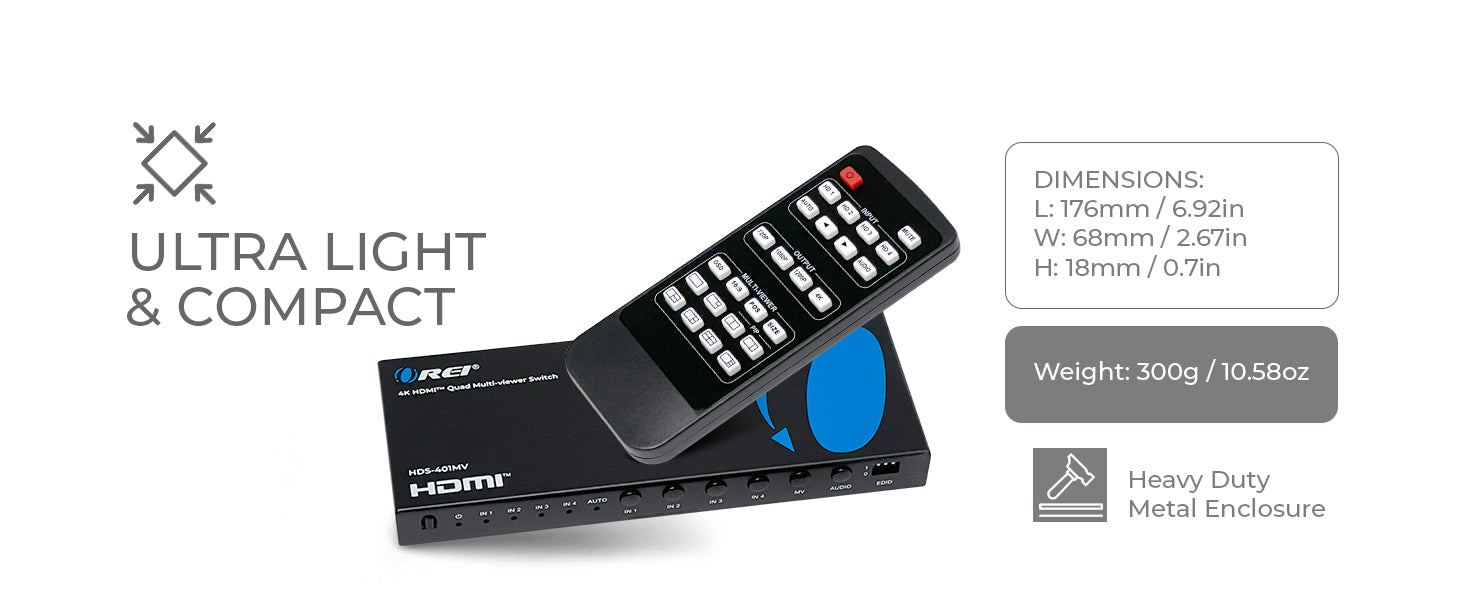 The HDS-401MV is a compact 4x1 Quad Multiviewer HDMI switch designed to display four input sources on a single screen or switch between them seamlessly. Supporting resolutions up to 4K@30Hz with 10.2Gbps video bandwidth, this unit delivers sharp, high-quality visuals for both home entertainment and commercial AV installations.
