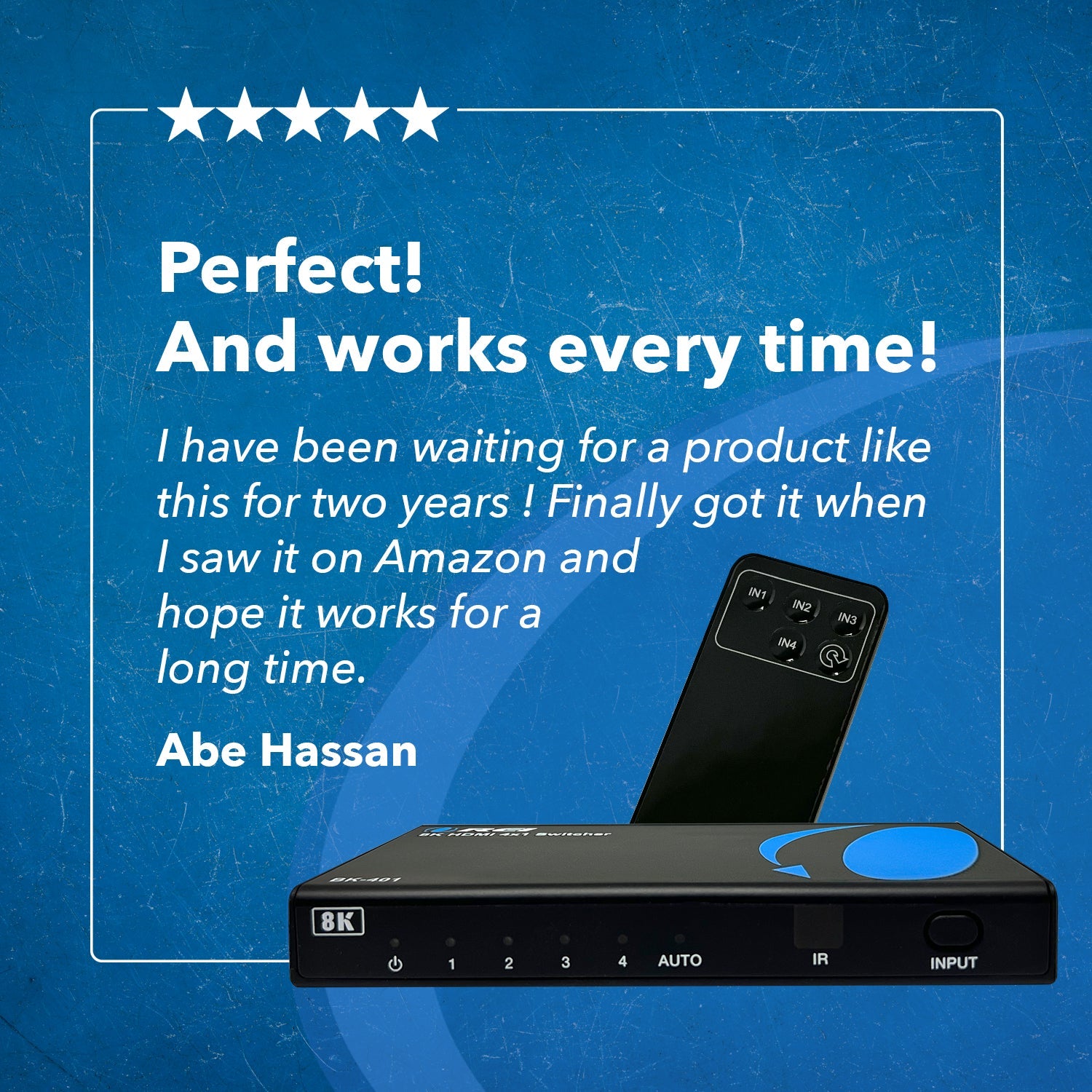 The 8K HDMI 4x1 switcher lets you connect four HDMI devices to a single display, easily managing multiple sources with the push of a front-panel button. Designed for quick, reliable switching, this switcher HDMI 4x1 is perfect for home theaters, gaming setups, video conferencing, and more. Simplify your AV experience with this versatile switch HDMI port solution.
