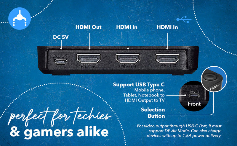 The USB-C input supports USB-C to HDMI video output (DP Alt Mode required) from devices such as Chromebooks, MacBooks, smartphones, and tablets. It also delivers 1.5A power to keep your device charged during use, making it an excellent choice for those seeking a USB switch with HDMI capability that also powers their connected devices.