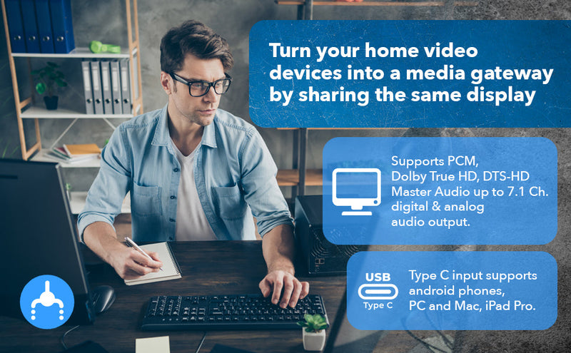 Supporting resolutions up to 4K@60Hz and compliant with HDMI 2.0 and HDCP 2.2, this compact switch ensures top-tier video and audio performance. It also supports Dolby TrueHD and DTS-HD for high-quality digital surround sound. The USB-C input not only delivers video (with DP Alt Mode support) but also provides up to 1.5A of charging power to keep your device powered during use.