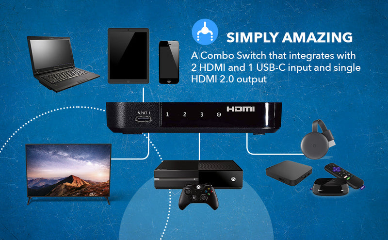 The OREI UHD-301C is a 3-in-1-out switch designed to streamline your home entertainment or office setup by integrating two HDMI inputs and one USB-C input into a single HDMI output. It allows users to easily switch between three video sources—such as a streaming box, gaming console, USB-C laptop, or Android smartphone—using the onboard button.