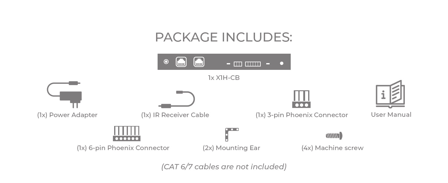 The X1H-CB offers a PoE-enabled VIDEO LAN port, an IR input via 3.5mm jack that accepts 12V wide-band IR signals for flexible control options, and four GPIO ports with selectable 5V or 12V outputs for versatile control. Fully compatible with third-party control systems and built with surge, lightning, and ESD protection, this unit delivers dependable 24/7 operation in commercial and industrial environments.