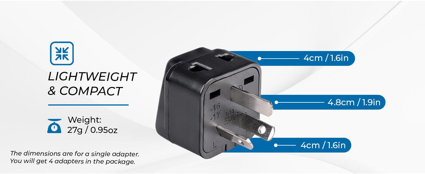 The P21-16-4PK is designed in the US and it’s our top choice for travel adapter to use in Type I outlets. It's compatible for use with dual voltage or worldwide voltage devices .It features one socket to connect a N. American 2-prong or a 3-prong power cord to charge your devices.